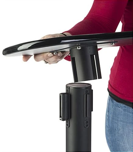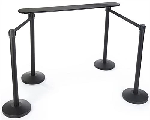 This stanchion writing surface allows patiently waiting patrons to fill out documents and organize paperwork before reaching the clerk’s desk. It makes a line move along faster by giving customers table space while they wait, so when they reach the front they don’t waste time fumbling through documents. This stanchion writing surface is an ideal crowd control method with the 6.5’ retractable belts and provides a countertop to display the needed documents with ample space for several people to fill them out. While waiting in the queue to check bags at the airport, travelers can fill out baggage tags and make sure they have taken out passports and important IDs. Long lines at the DMV can take hours even after taking the time at the entrance desk to fill out forms, but this allows them to save time by combining the two. The 4 steel posts each have a retractable belt and a 19mm thick table made from medium-density fiberboard for stability in crowded areas. This stanchion writing surface provides the most organized crowd control method to efficiently use everyone’s time as they wait and make the line move along smoother.