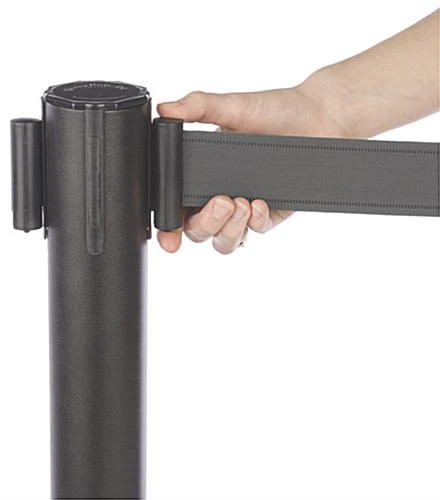 A retractable barrier post is designed with a gray belt and heavy-duty base. These crowd control systems keep customers in line in high traffic areas. Each retractable barrier post, with gray belt, extends from 0” to 6’-7”. The rope stanchions are constructed of black powder-coated steel. This retractable barrier post, for crowd control, has a built-in 4 way belt receiver for multiple configurations. Each gray belt features a built-in locking mechanism. Each retractable barrier post, that is a rope stanchion, is easy to assemble and disassemble. No hardware or tools are needed to install these crowd control systems.