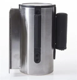 A wall mounted retractable barrier features a black adjustable belt. This mount can extend past 7’ long. Each wall mounted barrier, with a black retractable belt, can be pulled from 0” to 7’-2”. Create a crowd control line with these stainless steel stanchions. This wall mounted retractable barrier that can mount in a business, is designed with quality materials. The stainless steel mount is designed to last. A wall mounted retractable barrier, for crowd control, is brushed satin. The design will complement a variety of settings.