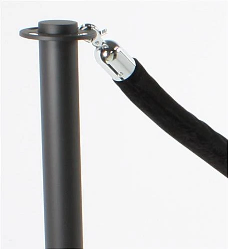- Modern flat-top stanchion design features black powder-coated steel posts and black velvet hanging rope to provide an upscale means of crowd control, line queuing or display protection