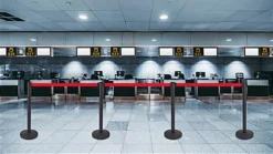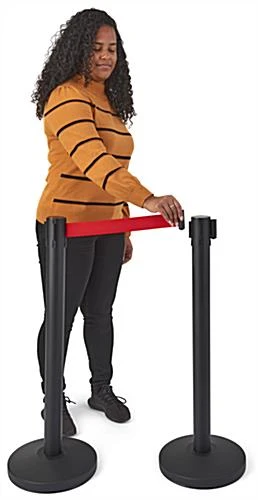 Red Retractable Belt Barrier with Black Concrete Weighted Round Base for Stability