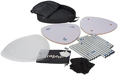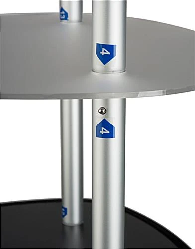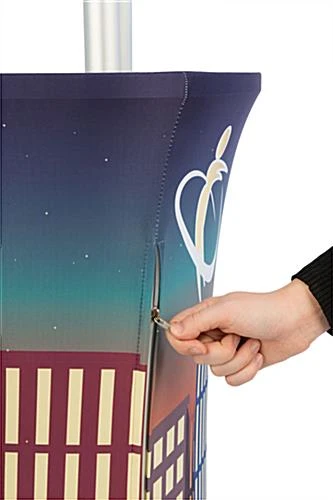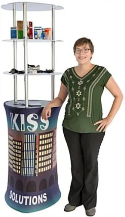 This promotion graphic tower display enhances any trade show or event with dye-sublimated printed fabric and 3 acrylic shelves to showcase products and goods. Standing at over 6’, these portable exhibition counters uses height over width to save valuable booth space while attracting attention even in large crowds. With labeled poles and a push-and-click design, the aluminum tower display is easy to assemble and includes all necessary hardware, including a pair of soft cotton gloves to minimize fingerprint marks while handling. The printed artwork stretches from the bottom of the unit and extends to a channel built into the top of each of the counters. Simply push the silicone edge into the groove to secure in place and create an attractive taut look. While many portable exhibition stands have one surface to merchandise goods and distribute literature, this unit implements 3 high-impact acrylic shelves that can support up to 33 lbs each and will resist damage during travel to the next event. When the show is over, simply pack the tower display in the included carrying bags for easy portability from one location to the next.