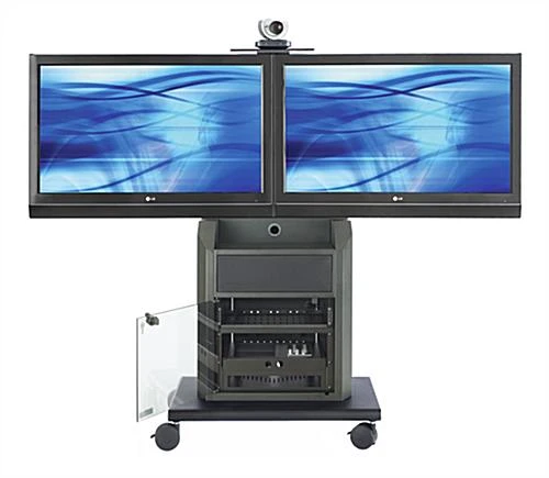 This multimedia cart that supports screens up to 55″ is highly visible even in large conference rooms. The stand has an overall load capacity of 300 lbs. and is highly durable. This mobile TV display, multimedia cart that includes rack mount storage ensures devices stay in place while moving the stand. The 5″ caster wheels glide easily over many floor surfaces even with the heavy presentation equipment installed. This multimedia cart that boasts a camera shelf is an ideal video conference stand for modern offices. Users can easily rearrange a space with this rolling trolley. Each multimedia cart is locking with a tinted tempered glass door that resists shattering. The sleek appearance is suitable for nearly any environment. This multimedia cart that is constructed of 100% solid steel is resistant to dings, chips, or other damage. These heavy duty displays can hold a laptop, cable box, internet modem and more inside the storage compartment. This video conference multimedia cart comes with a 6-outlet sure protector to safely plug in multiple devices. These deluxe carts have a smaller footprint than many mobile AV carts to preserve floor space.