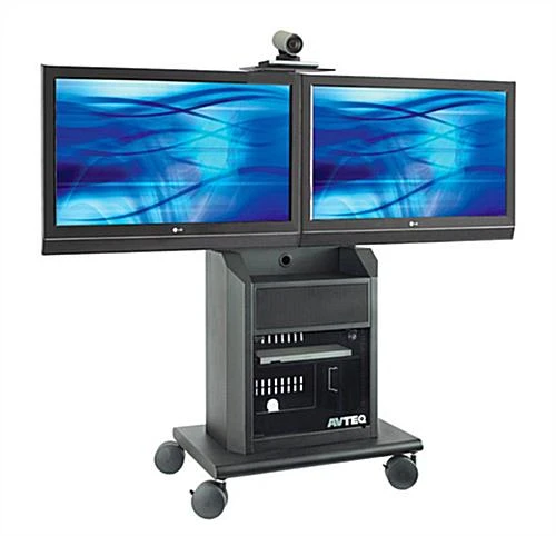 This dual mount multimedia cart, also known as a presentation workstation, features a universal mounting bracket. Nearly all television models within the mounting pattern and size constraints will be compatible with the bracket. This steel multimedia cart is designed to last and therefore worth the initial investment. With more features than most comparable models on the market, this deluxe TV credenza is a great value. This mobile display includes adjustable handles for ease of movement. The 9RU storage bracket is a standard 19″ wide and fits many AV devices. Modern office buildings will benefit from this stylish TV rack. Manufacturer model# RPS-800L.