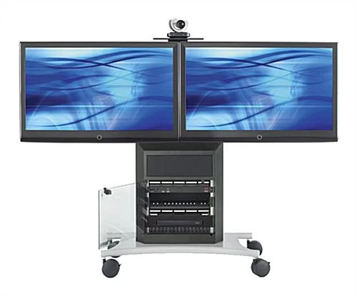 This dual TV cart that accommodates two large monitors is ideal for conference rooms, schools, and more! The five inch casters roll easily even with the two large monitors and AV equipment. The heavy duty dual TV cart is constructed from steel and has a load capacity of up to 350 lbs. The VESA compatible bracket has a mounting pattern of 200mm x 200mm through 800mm x 600mm and suits nearly any flat panel within the size constraints. The rolling LCD display also provides flexibility when choosing a conference room arrangement and it can be moved as needed. Each double mount features hinged rear access panels to plug in or unplug AV equipment. The front door of the cabinet is locking and features tinted tempered glass construction for a modern appearance. The unit also includes an AmpliVox® speaker module that is built-in for high quality sound during video confrerences.