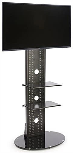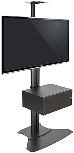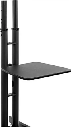 This rolling TV screen display features stylish finish that is sure to match any boardroom or classroom environment. Each mount is designed to last and is well worth the initial investment. The high-technology display has more features than most flat panel stands on the market. Extensive ventilation ensures that air flow is ample to keep the electronic devices cool within the storage cabinet. The adjustable camera shelf is an added function to make video conferences effortless. Inside of the cabinet, users will enjoy a convenient 8RU (rack unit) storage bracket that securely attaches to industry-standard equipment. This quality bracket helps ensure that AV devices do not move around while moving the stand.