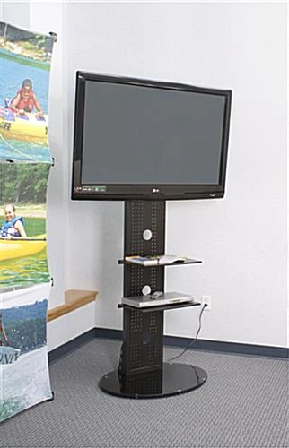 This monitor stand features two metal shelves that can hold various electronics (such as cable boxes, DVD players, and video game systems) to complement your plasma or LCD television. Each TV mount also features cable management ports to place wires through, effectively keeping them out of view to create a tidier display. This black stand can hold a 37″ to 70″ plasma or LCD monitor that weighs up to 165 lbs. With its heavy glass base, this TV mount is very stable and holds large screens securely. Each unit also features tilting brackets that allow you to angle your television 15° up or down to provide the best view. Purchase a stand for use in your home, office, or retail establishment today!