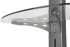 This modern flat screen TV stand has an adjustable tempered glass shelf that is ideal for holding a DVD player or game system. Each wide panel monitor holder features integrated cable management to keep unsightly wires off the floor and out of sight for a professional look during media displays or presentations. The LCD TV stand also has four base feet designed for stability on both rugs and bare floors. Additionally, each LED holder includes green-tinted tempered glass that provides a stable yet stylish base. The silver bracket is VESA compliant and can accommodate most 25″ – 55″ wide panel monitors weighing up to 66 lbs. This stand has a stylish design that looks good at home, in reception areas, conference rooms, or residential environments.