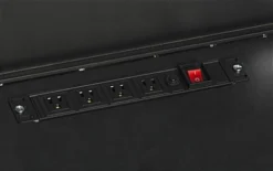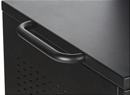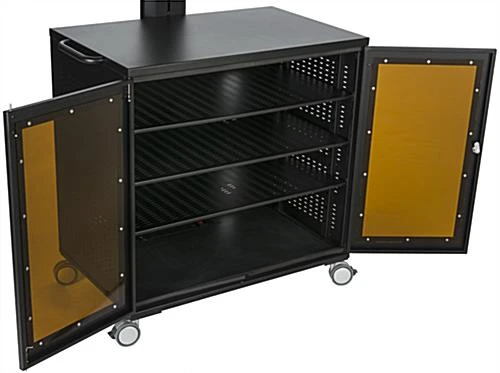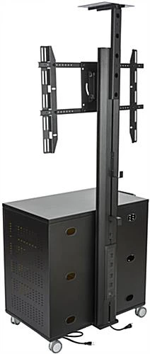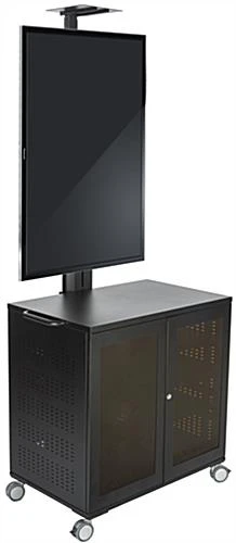 Safely store equipment in this floor standing TV cart with power management. The black display stand cabinet features adjustable shelves and an incorporated electrical strip with an on/off switch. With a maximum capacity of 330lbs, this durable TV cart is capable of confidently holding screens up to 84”. The black powder coated finish on this display stand looks professional and easily blends well into any environment. Enabling mobility from room to room, 4 casters offer an ease of movement when needed while 2 brakes allow stability. Plexiglass cabinet doors allow TV cart devices to remain out of sight while still keeping remote control functionality.