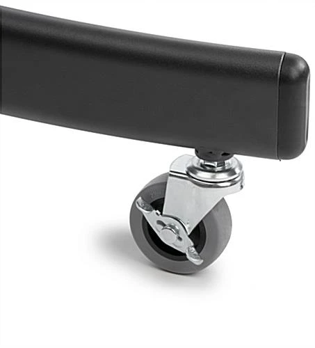 A portable TV stand with case features a folding base that is easy to pack away and transport to trade shows, exhibits, and similar events for a mobile design that helps advertise products and services. The tilting bracket can be positioned at different angles for optimal viewing and also includes (5) optional height adjustments between 51” and 69” (to the center of the mount) to situate an LCD in the ideal spot. Available with each model is a case that is lined in EVA foam padding and has (2) rolling wheels, (2) recessed handles, and (1) luggage handle for easy mobility. Integrated cable management collects wires inside of the extension columns to minimize the possibility of tangled cords and keeps them organized. The TV stand with case is a larger display that has a maximum 700×500 VESA standard capability bracket designed for 32” to 65” LCD screens that weigh up to 110lbs. Four locking caster wheels provide easy transport of the cart and keeps the unit stationary when locked in position.
