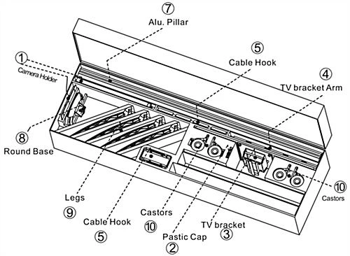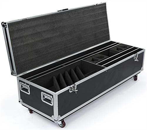 Confidently carry your trade show display to various events with this TV stand with custom case. Built with robust construction and soft foam, your mount will be kept safe from dings and scratches while on the road. A wheeled base on both the black TV stand and container allow easy movement through venues and crowded trade shows. The mount supports various features such as rotating or tilting and can accommodate flat panel displays ranging from 30” to 84” in size. Each container is divided into sections for every piece of the disassembled unit to fit into for safe keeping. Furthermore, when not in use you can lock your TV stand away with the 4 padlock receptive latches.