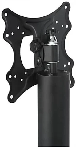 This single pole TV stand features a black steel and aluminum alloy build. The monitor mount display is height adjustable from 35.5” to 51” tall by simply pushing the gas spring down. The black TV stand accommodates screen sizes of 32” to 42” and up to 22 lbs, with a VESA size of 200×200. With 3 locking casters, the monitor mount display features ease of portability as well as stability when not in use. The TV stand also features an accessories shelf for any extra items. With tilting and swiveling capability you can adjust the screen for comfortable viewing.