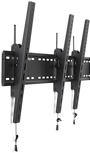 Supporting a multi screen setup, this 3-monitor wall portrait TV mount can create a seamless large display. With VESA compatibility this fixture can support LCD, LED, and most other popular television types. Additionally, the steel wall portrait TV mount can hold up to a combined 264lbs to ensure your flat panels are kept secure. Each multi screen setup is perfect for showing menu items in bars, arrival times in airports, or maps and class information in universities. The VESA brackets can tilt your LCD or other panel between 10° – 15° and be removed from the back plate with a quick pull and lift from the release cable. Showcase multiple messages at once with use of this portrait TV mount which can support screens ranging from 30” to 60”.