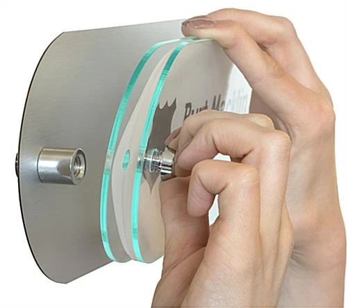 Manufactured from acrylic and formica, this door sign with brushed aluminum backer provides a professional looking directory. Perfect for name plates, these holders can also be wall mounted. Unlike other wayfinding systems, you can create custom graphics and inserts for your oval door sign with the included film sheets. Design and print name plates from your office printer and place between the two acrylic panels. This holder is mounted to the wall with two metal standoffs that screw off easily allowing your custom graphics to be swapped out quickly and easily. The standoff grips are subtle enough to not obstruct the message on your door sign.