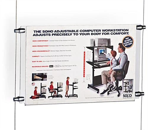 This cable mounted poster holder is ideal for use in retail to show sales, and new promotions. These suspended frames are the perfect marketing display. This poster holder that is made of 1/8″ thick acrylic is frameless. This acrylic signage makes it easy to change out graphics when there is a need for new marketing materials! This poster holder that is ideal for displaying advertisements is an exciting yet affordable way to attract new customers!