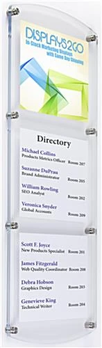 This customizable door sign features an opening for (3) 8.5” x 11” fliers or posters. The office display mounts to the wall using 8 silver standoffs. Each door with (3) 8.5” x 11” inserts sign will sit approximately 5/8” from the wall. Great for an office, school, hospital or business, these custom name plates can be used to easily identify room numbers or conference rooms. Because each door sign accommodates a common size of paper, it does not require special printed business materials. Users can also choose to display (1) 26″ X 11″ max size custom poster. This product features the same design concept as our successful, do-it-yourself DSIGN series.