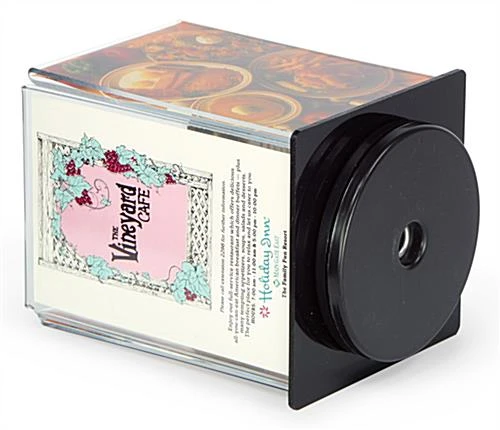 This table sign holder is a standard quad-fold display with a twist! Use this tabletop frame to advertise many specials or menu items in one compact unit. This table sign holder is attached to a smooth running, quiet turntable made of plastic. The base will not leave rust marks on counters or tabletops. Each side of this table sign holder can accommodate a 4″ x 6″ menu card or graphic. This is like getting four frames for the price of one. Restaurants often use this table sign holder to promote new menu items, or seasonal beers and other drink specials. Each frame has an open bottom, making it easy to change signage.