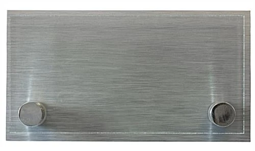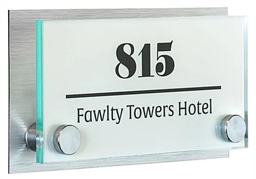 Keep your business directories up to date with this office door sign with brushed formica backing. Print your own number plaque or name plate on the included clear or frosted sheets. Change out your graphics quickly by loosening the aluminum standoffs of this custom door sign. Use this item as a room number plaque, name plate, or for wayfinding purposes. The acrylic panels and aluminum plating are fastened to the wall with two chrome through-grip standoffs. Create a custom and professional wayfinding system for your business with this door sign.